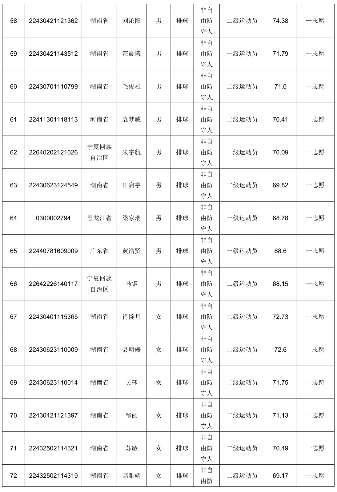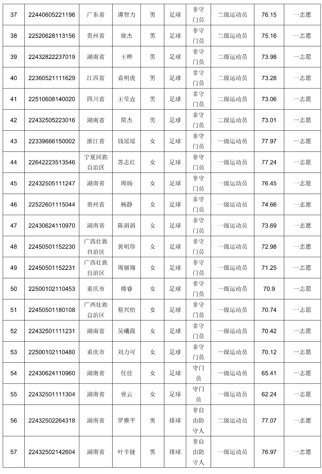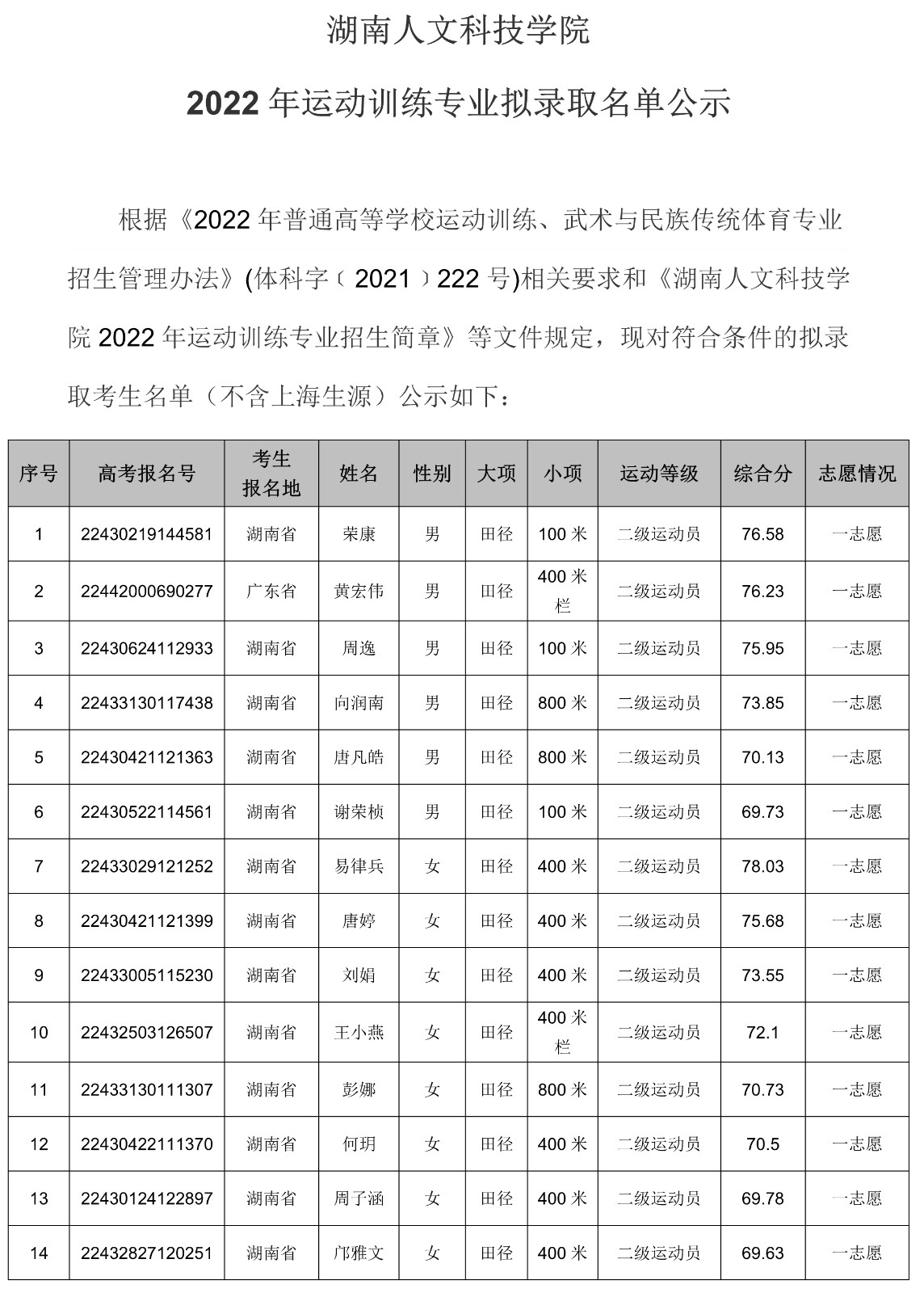 湖南人文科技学院2022年运动训练专业拟录取名单公示