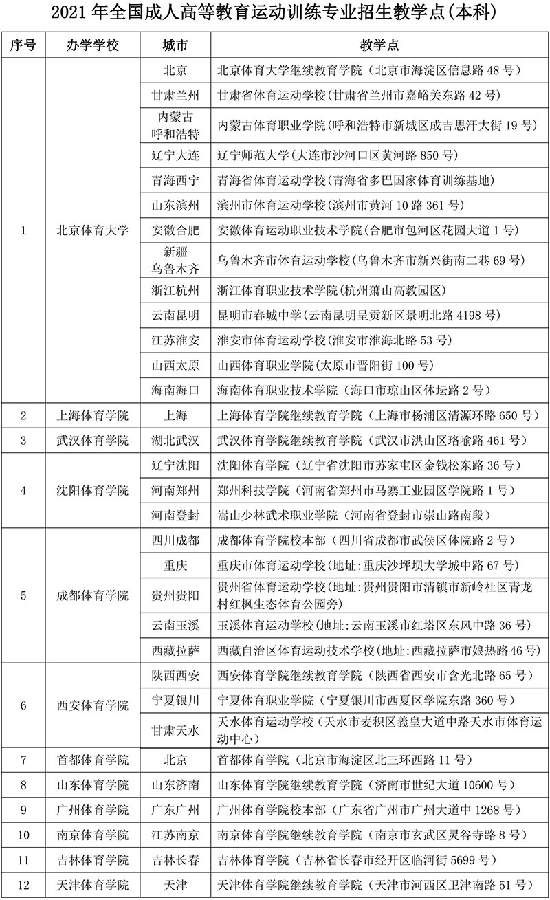 根据《2021年全国成人高等教育运动训练专业招生管理办法》(体科字〔2021〕119号)(简称《管理办法》)有关规定,经审核,共29个专科教学点、32个本科教学点符合《管理办法》要求,现将名单公示如下: